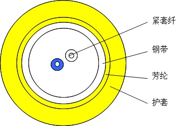 煤礦用室內(nèi)光纜使用Φ600µm阻燃緊套光纖作為光傳輸介質(zhì),采用不銹鋼軟管來增強光纜的抗扭轉(zhuǎn)性能,外覆一層芳綸作為受力加強單元,最外擠制一層低煙無鹵材料(LSZH,低煙、無鹵、阻燃)護套而成。